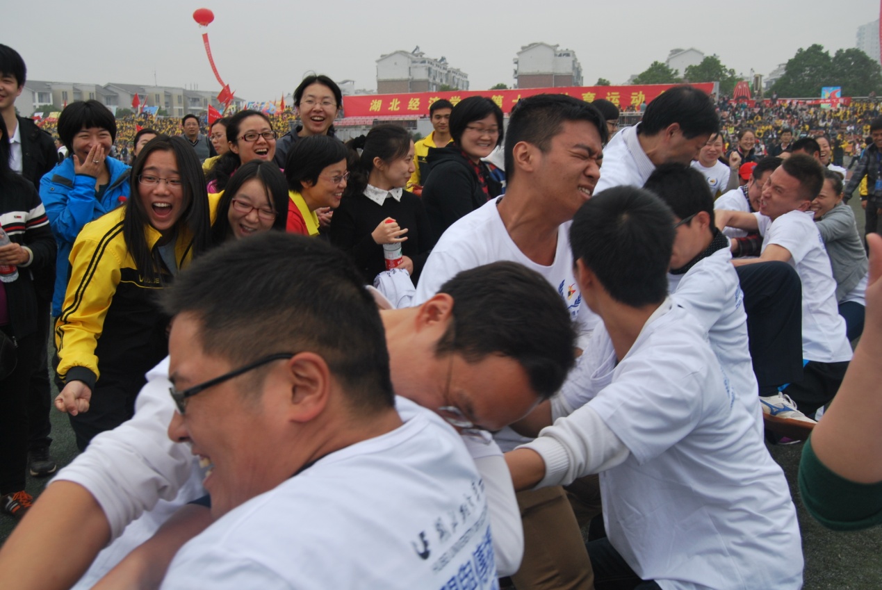 下午四点二十分,双方的运动员以红布条为中心分别聚集在粗绳两端,啦啦队、志愿者们将场地围得水泄不通。公司运动员手握麻绳、脚对脚,从第一位运动员起排成一字身体往后倾斜。口哨声响起,运动员们咬紧牙关、扯住绳子往后倒,“新闻,加油!”周围新闻学子们的喝彩声一浪高过一浪。本次比赛中接连两局,红布条均移向统计公司一方。四点二十四分,此次拔河比赛以统计公司获胜落下帷幕。