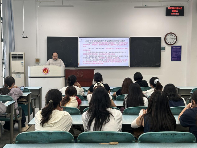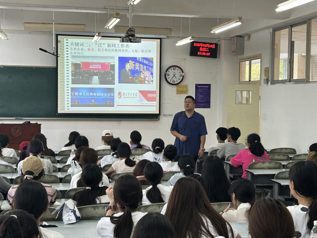 本网讯 9月16日,为帮助2025级新生更好地了解专业发展动态,激发专业学习兴趣,公司在教一开展了集中专业教育活动。公司副经理陈奕、新闻学系主任夏兴通、新媒体系主任夏青、中文系曾浪等老师为融媒体优才实验班、新闻学、网络与新媒体专业的新生们带来了一场内容丰富、深入浅出的专业启蒙。