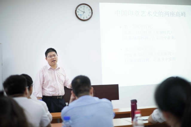 魏晓伟老师从篆刻与印章的区别谈起。魏晓伟解释之所以没有直接用篆刻艺术作为本次课的标题,是因为篆刻是把印章这种东西艺术抽象化形成的一个概念,篆刻的本质是印章。但是,篆刻更多是倾向于艺术层面,印章更多倾向于实用层面。中国篆刻艺术有两座难以跨越的高峰,一个是在先秦、汉印时期,所谓的“青铜时代”,这个时期的印章以实用为目的,在实用中求美,具有代表性的是古玺印和汉印;另一个高峰是在明清流派印时期,所谓的“石质时代”,这个时期的印章以审美为目的,在求美中实用。实用性和艺术美是印章的两个基本属性,也是两个基本追求,两者密不可分,缺一不可,正是不同时代不同流派不同创作者对于两者的侧重点不一样,才有了姿态万千的印章和百花齐放的篆刻艺术。