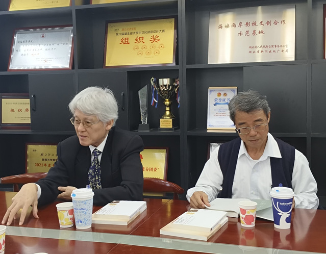 双方还就中华优秀传统文化教育展开了讨论。专家们提到,台湾中小学将书法、古诗文及“儿童读经”纳入课程,社区亦开设有“四书五经”研习班,实现对儒家思想的传承。同时,以《论语》为核心框架,兼容现代作家作品及外国文学改编内容,通过书法篆刻比赛、书院教育等形式强化实践。高董事长特别强调,台湾教育注重将“琴棋书画香花茶道”等“六艺”融入生活,推动礼仪习俗的社会化传承。曾浪老师认为,这种“生活艺术化”的实践,正是对“伦理的生活化、生活的艺术化”的最好践行,为传统文化的现代传播提供了重要启示。双方认为,两岸对中华优秀传统文化的弘扬高度一致。最后,中文系教师向专家赠送自编《大学语文》等教材进行切磋交流。