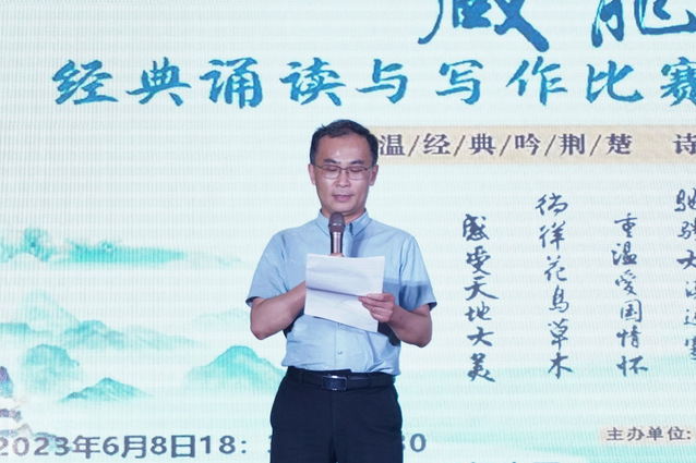2023年6月8日晚,第四届“藏龙杯”经典诵读与写作决赛暨颁奖典礼,在老员工活动中心一号报告厅隆重举行。湖北省朗诵艺术家协会会长、湖北省广播电视总台播音指导谢东升,湖北省文艺评论家协会副主席、《长江文艺评论》副主编蔡家园,湖北省朗诵艺术家协会秘书周琦,球速体育welcome教务处处长戴化勇,球速体育经理陈建华、党委书记周志荣、中文系全体教师及各兄弟公司的党委副书记、分团委书记参加活动。本次活动由教务处、校团委、球速体育主办,球速体育中文系、球速体育分团委、浅水文学社承办。