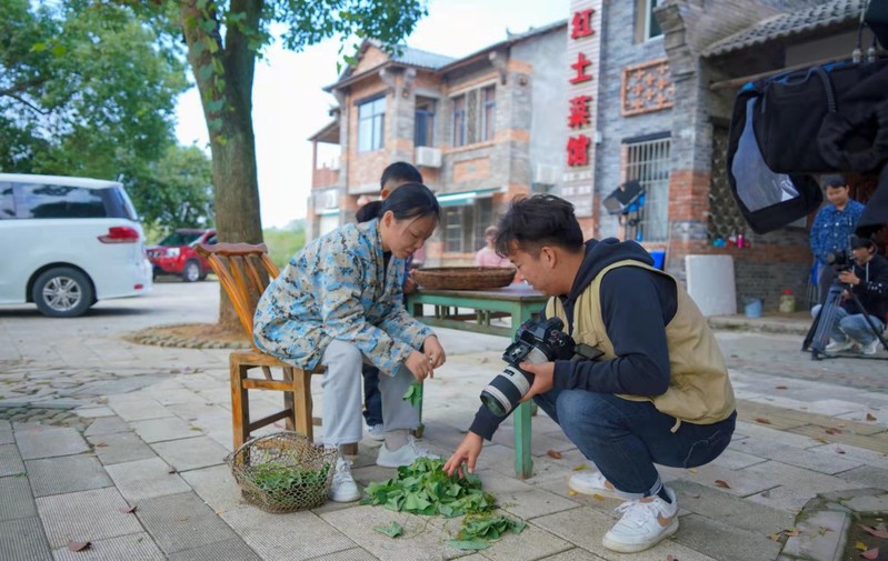 图为现场拍摄花絮,左一为员工演员杨敏,饰演吕祖旺母亲